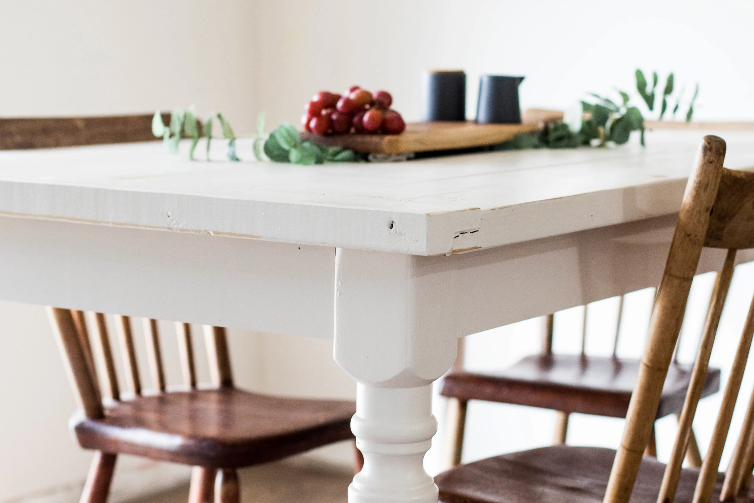 One thing, however, that we never collected along the way was a table. During our first years of marriage, we ate at the couch or on-the-go, but for a significant season, we didn’t have a table to eat at together. So when we moved into our last apartment, Dillon decided to take some time to build a large 8 foot farmhouse table. It was big, too big for our current house, so we gave it away. But when Nora started eating foods of her own, we decide that we needed a table for our home, one that fit our family and fit our tiny dining space.